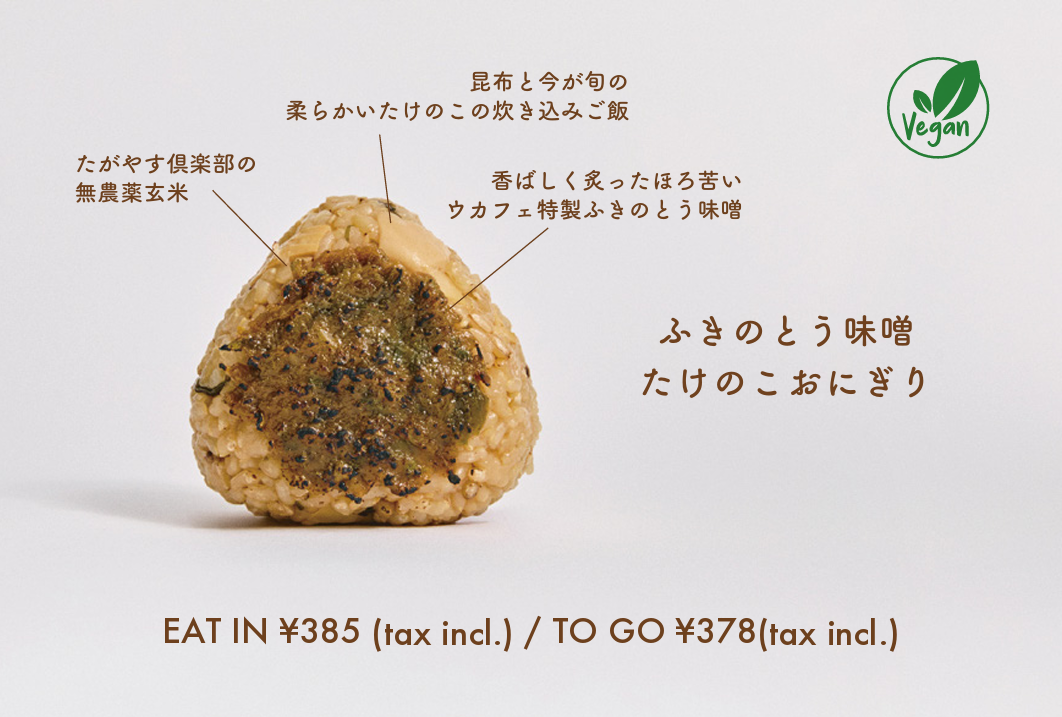 たがやす倶楽部の無農薬玄米を使い、昆布と今が旬の柔らかいたけのこの炊き込みご飯のおにぎり。ほろ苦いウカフェ特製ふきのとう味噌を塗り、炙ることで香ばしさをプラスしました。